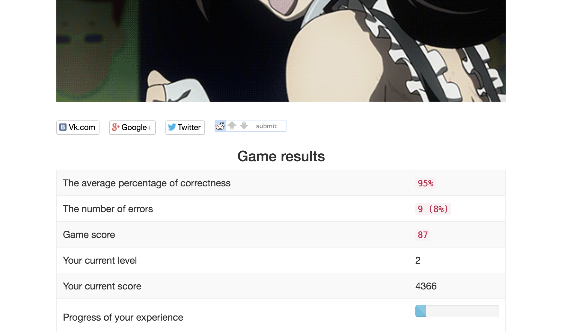 3.ゲームを終了すると、ゲーム結果ページ [下の画像を参照] i>が表示されます。 ここには、ゲームの統計、結果、現在のスコア、進行状況があります。 現在のレベル、スコア、およびゲームの統計情報は、プロフィールページのプロフィール画像の上に常に表示されます[上記の画像を参照]。